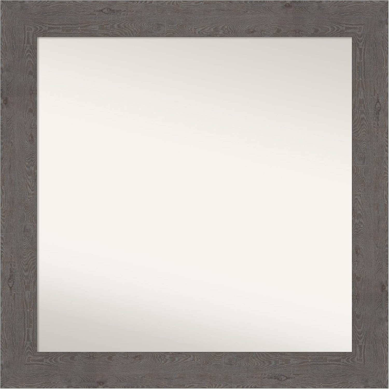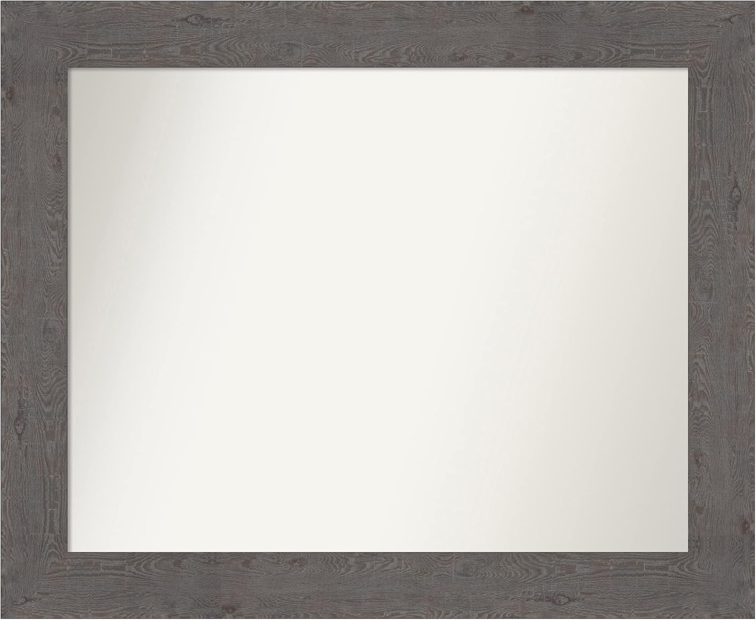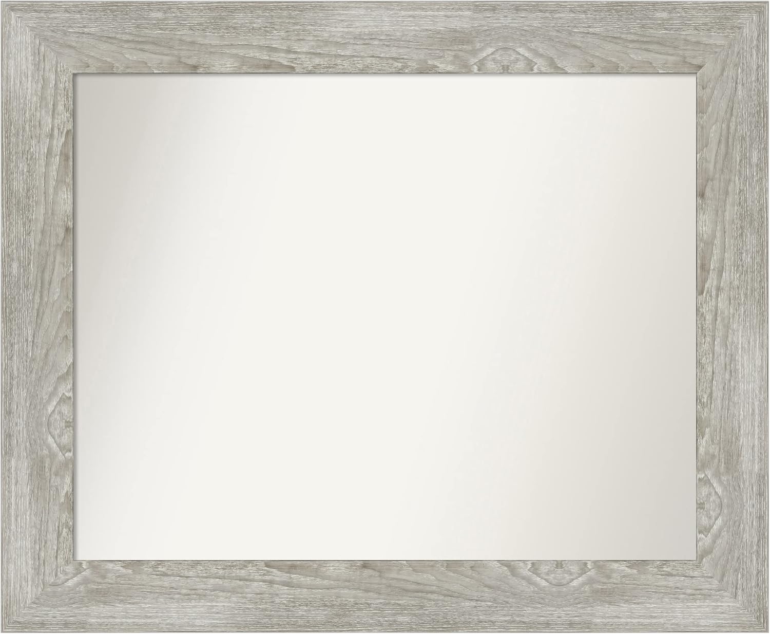 PRODUCT: Amanti Art Non-Beveled Wall Mirror; OUTER SIZE: Exactly 42 x 30 inches; FRAME: Dove Greywash; FRAME FINISH: Distressed; FRAME COLOR: Grey. The Dove Greywash frame is a rustic light grey frame with the look of weathered woodgrain. It has a simple, wide, flat surface with a slight scoop. Give your home or office the finishing touch with this framed wall mirror. Individually made using traditional custom framing techniques, it has the quality you would expect from your local frame shop. It holds its value with premium finishing that can be appreciated up close. Because of our attention to detail and focus on artistry, architects, interior designers, and homeowners alike choose this mirror to create beautiful living spaces.