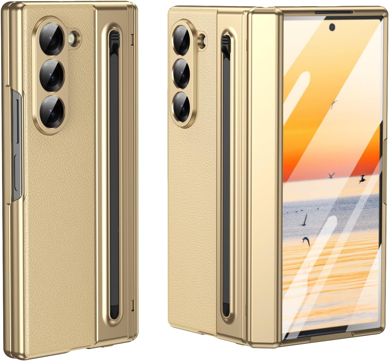 For Samsung Galaxy Z Fold 5 Case with Built-in Screen Protector & Hinge Protection and S Pen, Premium Leather All-Inclusive Protective Phone Cover for Galaxy Z Fold 5- Gold