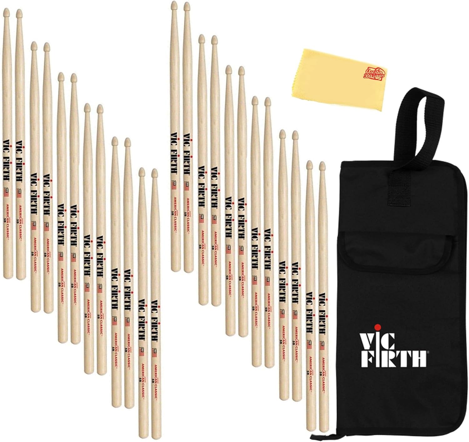The American Classic line combines tradition and Vic Firth style. With bold designs, the Classics are turned from select hickory to dense wood with little flex for a more pronounced sound. Hickory is also capable of withstanding a great deal of shock, making it highly durable. The tips are deeply back-cut for intensified cymbal response.Ideal for heavy rock, band, and practice.Plenty of power and durability.Medium taper for a great balance.Diameter: .630" | 1.6cmLength: 161/4" | 41.28cmTaper: MediumMaterial: HickorySurface coating: LacquerTip type: WoodTip shape: Tear DropTip surface area: MediumAdding value to your purchase, Austin Bazaar bundles your instrument with necessary accessories.Sticks are included so you can start playing right out of the box. An Austin Bazaar polishing cloth is included so you can keep your new instrument in mint condition.