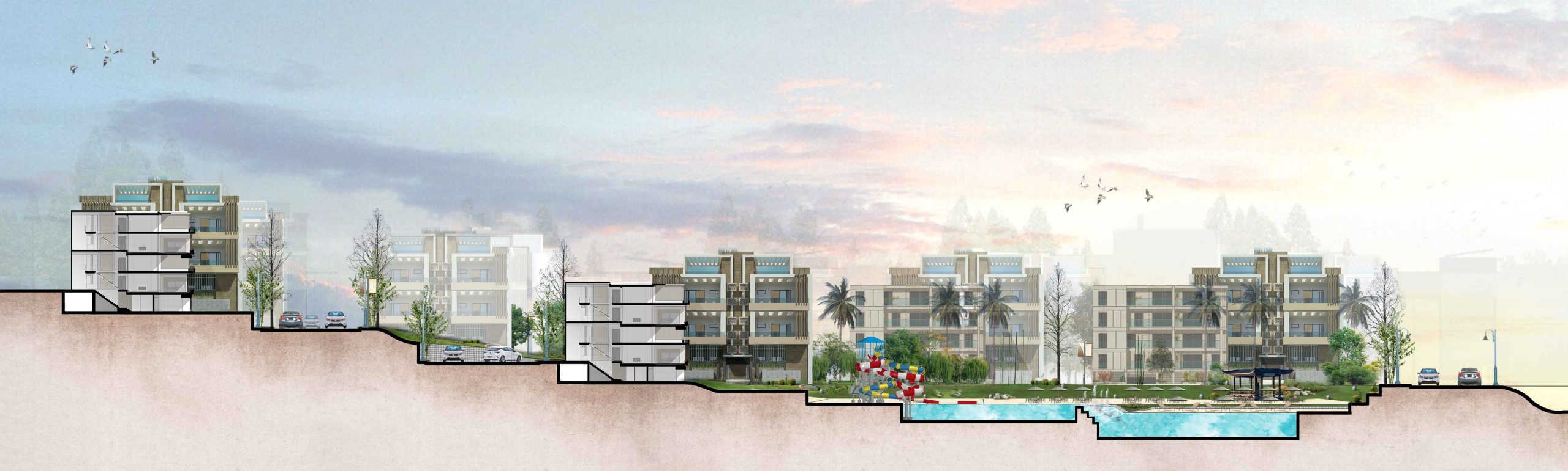 The residential units, stepping down the hillside, will be embraced by private and semi-private gardens, designed to enhance the sense of tranquility and offer residents their own personal connection with nature. We see cascading plantings softening the architectural lines, creating a visual harmony between the built and natural forms. Pathways, crafted from locally sourced materials, will meander through these residential areas, leading to communal green spaces designed for relaxation and social interaction.
