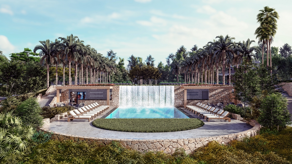 At the heart of this coastal retreat lies the Entry Park — a signature arrival experience that captures Azha’s spirit from the very first step. Visitors are welcomed by a stately avenue of palms, leading to an elevated panoramic view of the lagoons. A dramatic 4-meter waterfall cascades into the lower lagoon, creating a dynamic blend of sound, movement, and light.